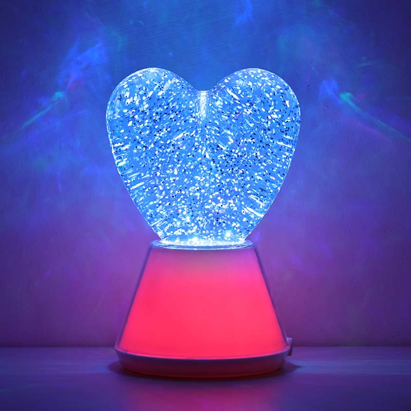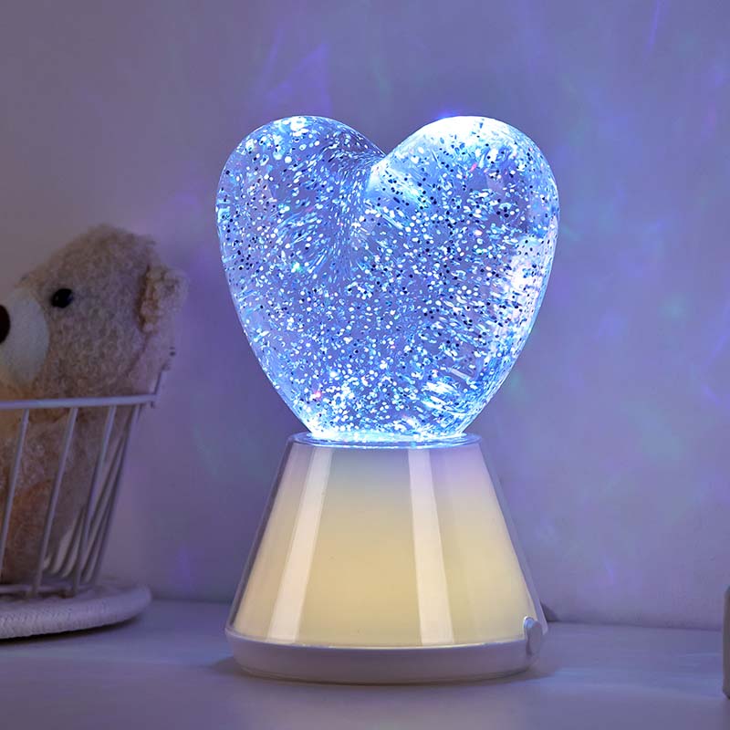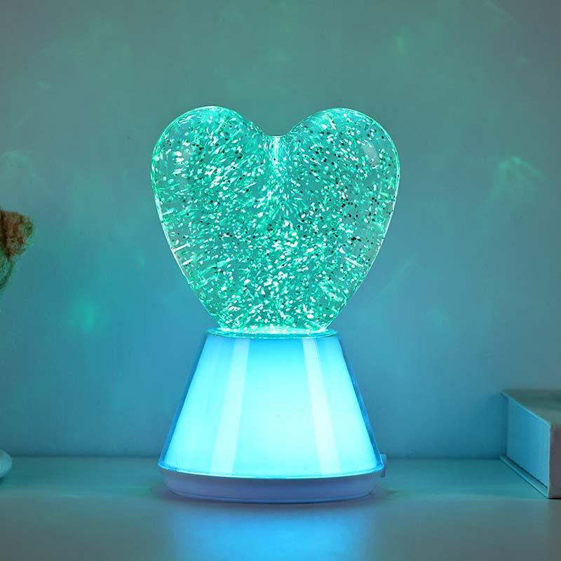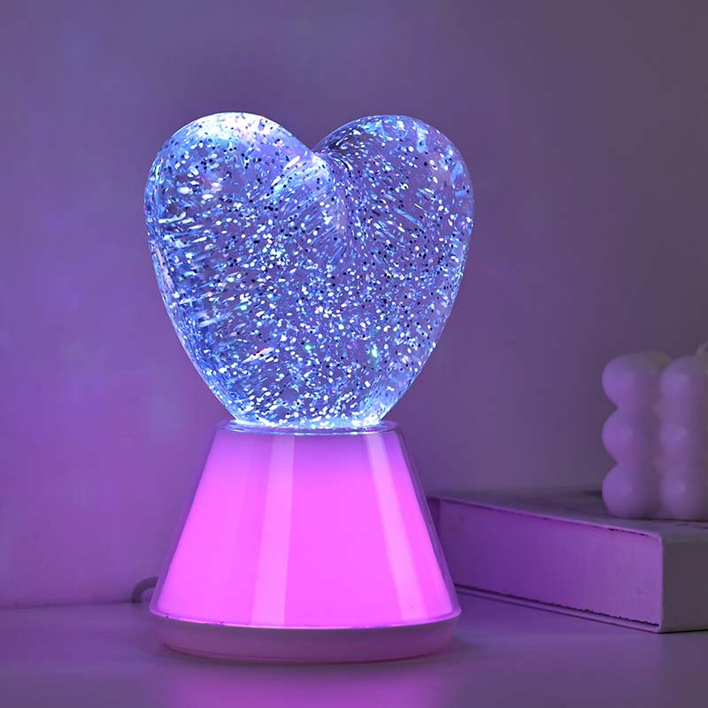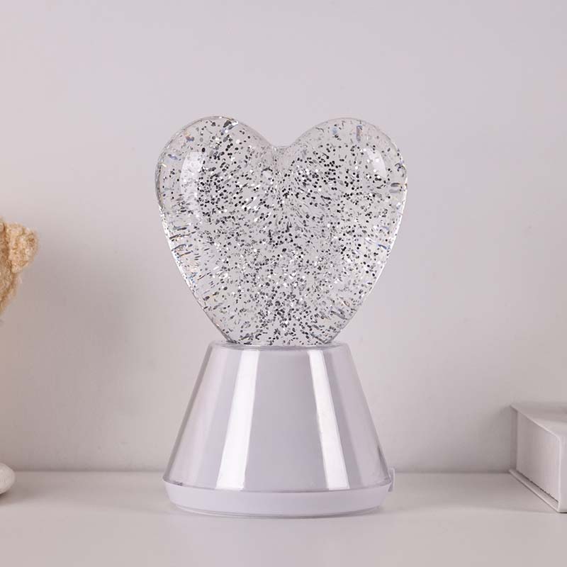 Veilleuse à paillettes liquides à couleur changeante avec abat-jour en forme de cœur. comporte une boule de verre exquise remplie d'un liquide mystérieux, dans laquelle flottent des paillettes scintillantes. Miraculeusement, la veilleuse à paillettes liquides aux couleurs changeantes avec abat-jour en forme de cœur, comme si elle dansait dans un monde magique.