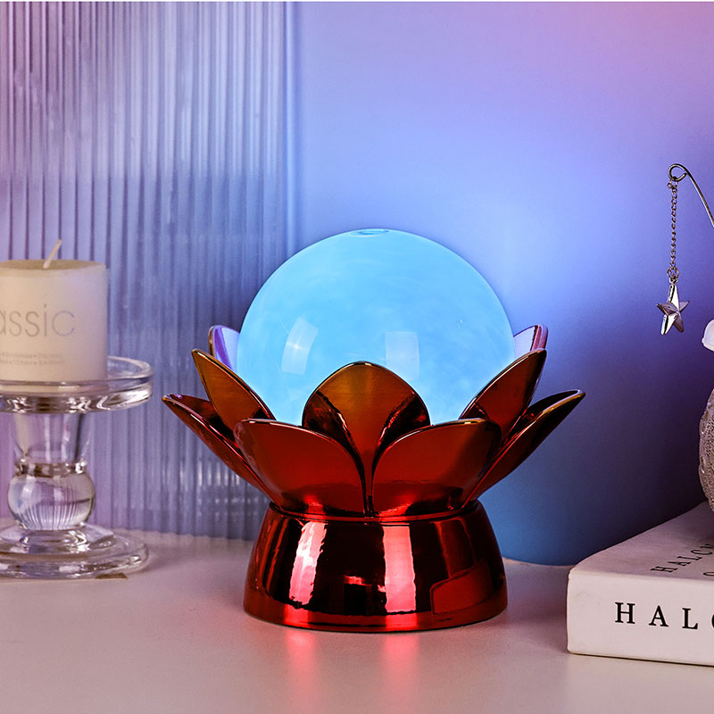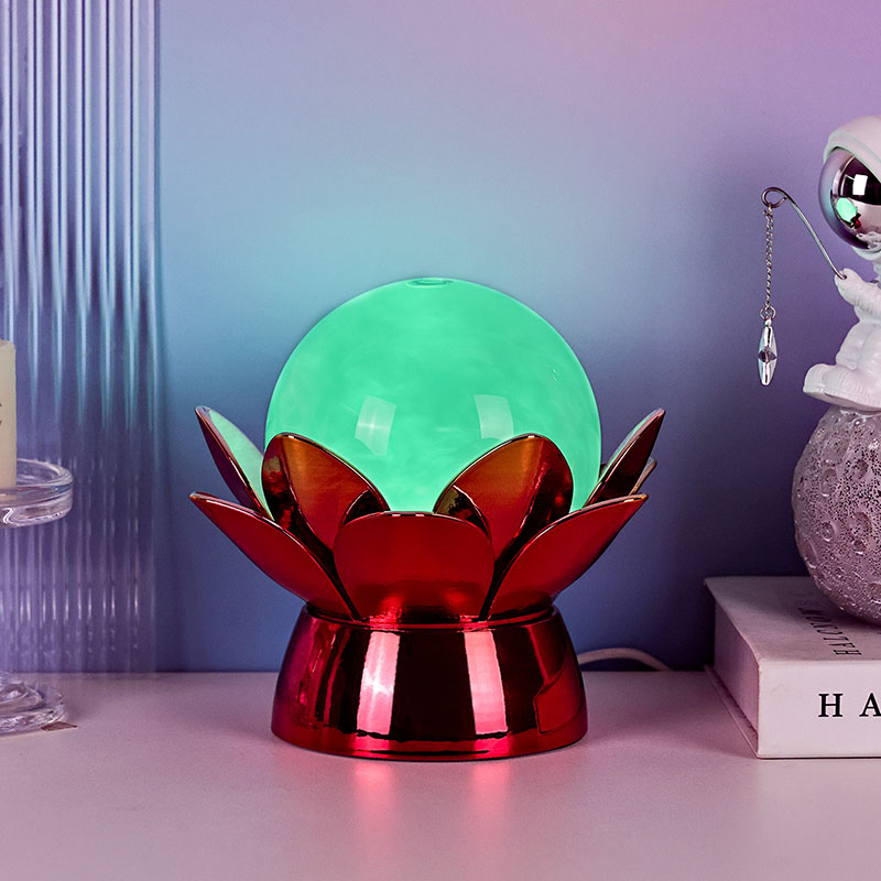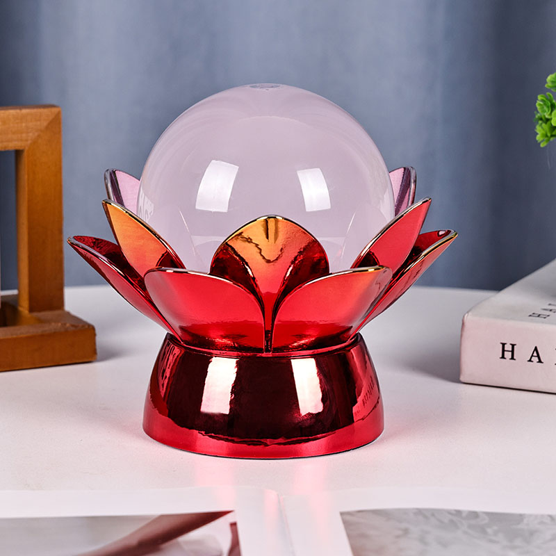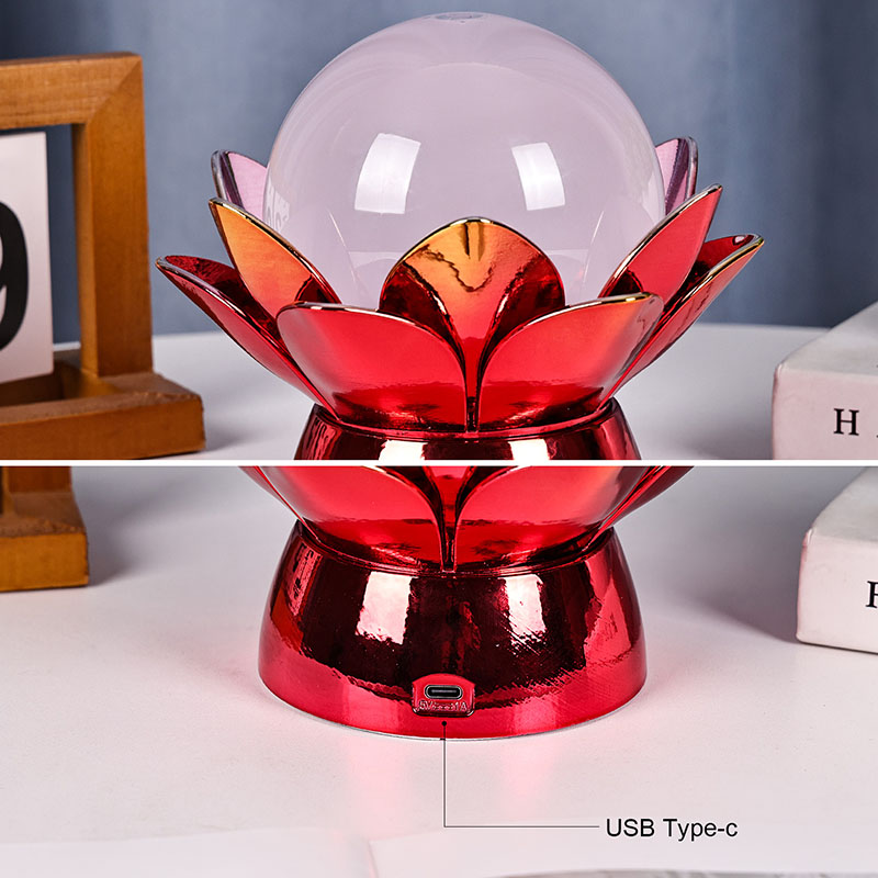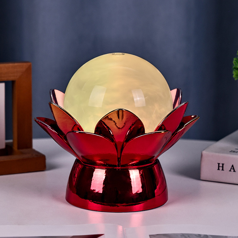 Fabriquée à partir de matériaux de haute qualité, la base est en métal poli avec une finition or rouge saisissante qui reflète magnifiquement la lumière, ajoutant de la profondeur et de la richesse à son apparence. Le motif du lotus sert non seulement de point focal esthétique, mais porte également une signification symbolique enracinée dans les traditions orientales, représentant l'illumination, la résilience et l'harmonie. La surface réfléchissante améliore l'impact visuel, faisant briller la lampe même dans des environnements faiblement éclairés.