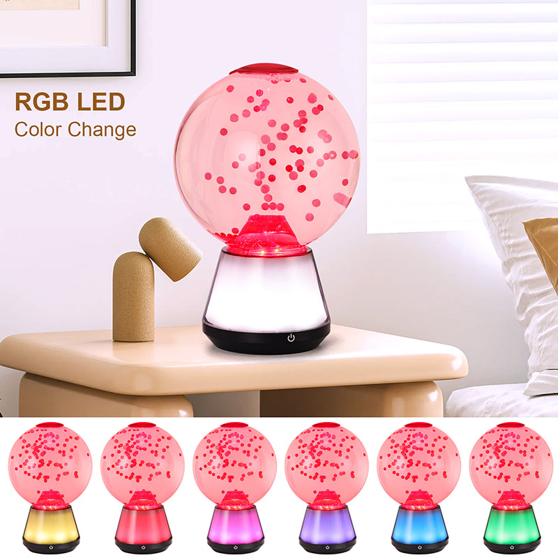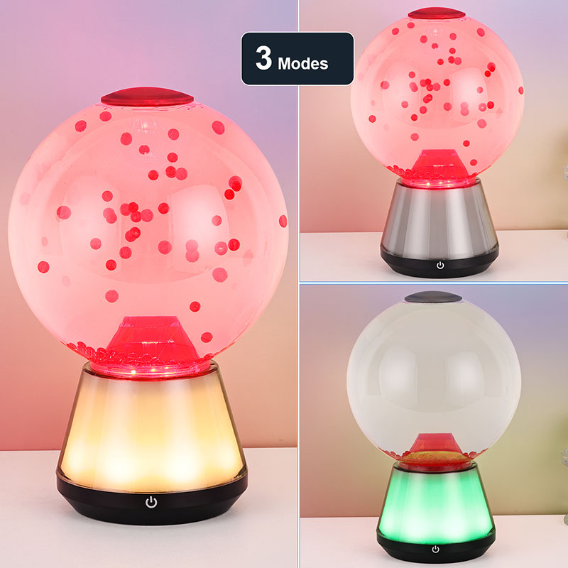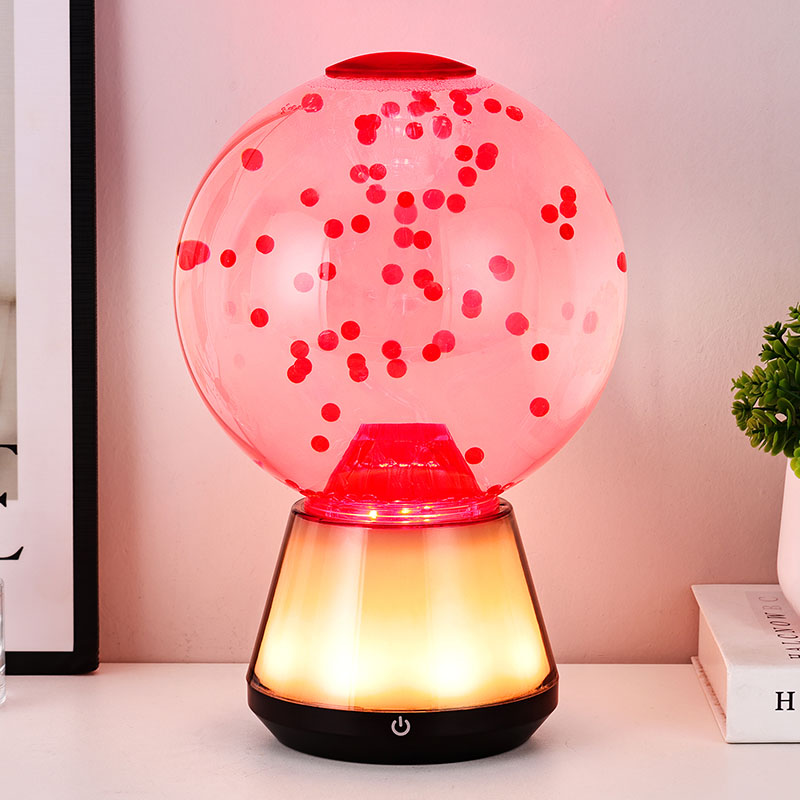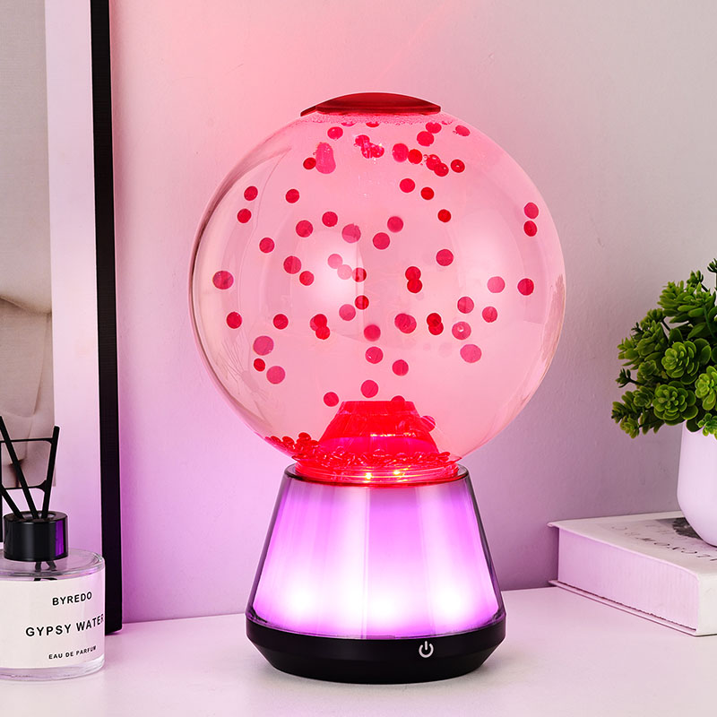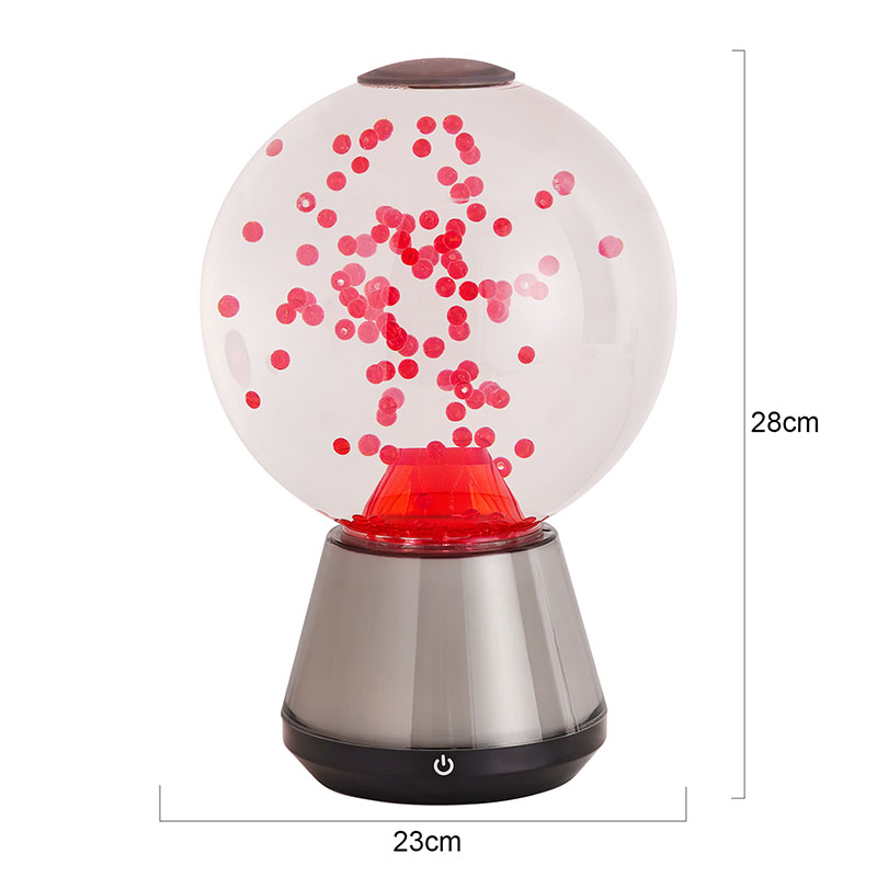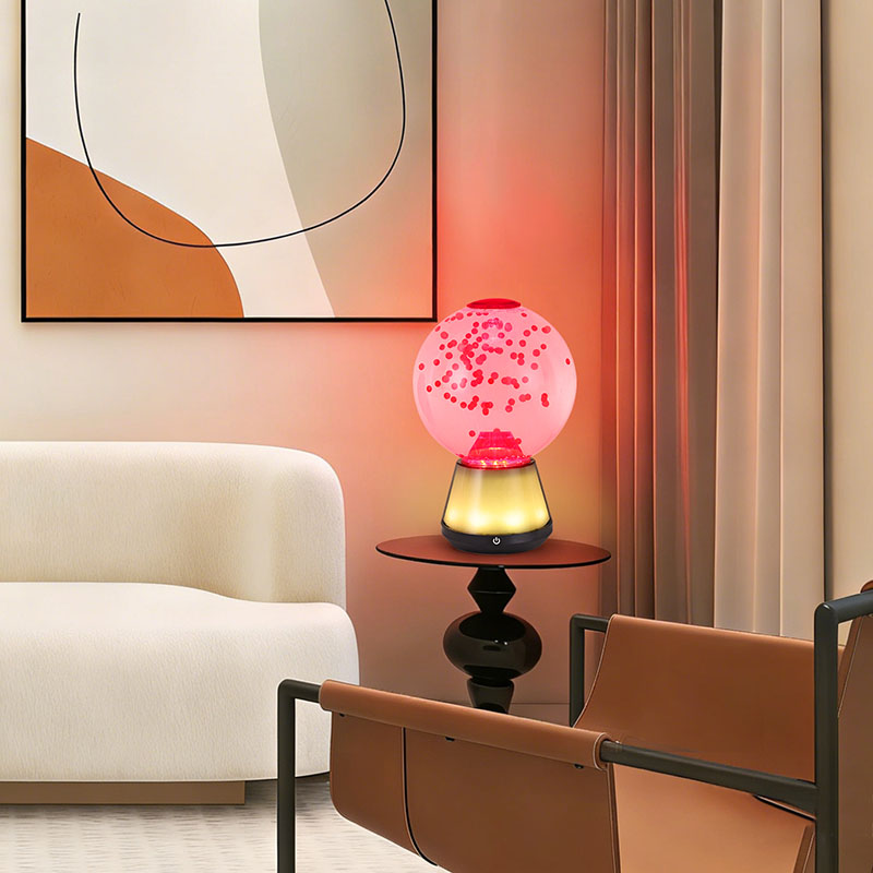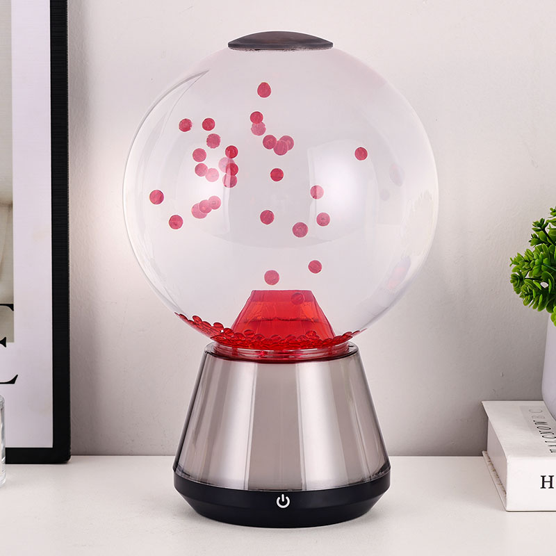 La lampe a un design en forme de boule ronde avec une finition lisse et brillante permettant à la lumière de se refléter magnifiquement sur les surfaces. À l'intérieur du globe, des centaines de minuscules sphères rouges flottent vers le haut dans des vagues rythmiques alimentées par une pompe de circulation silencieuse. Ce mouvement simule l'activité volcanique donnant l'impression d'une roche en fusion s'élevant des profondeurs de la terre. La base brille avec un éclairage RVB coloré passant par différentes teintes, dont le rouge, l'orange, le jaune, le bleu, le violet et le vert, offrant une expérience visuelle en constante évolution.